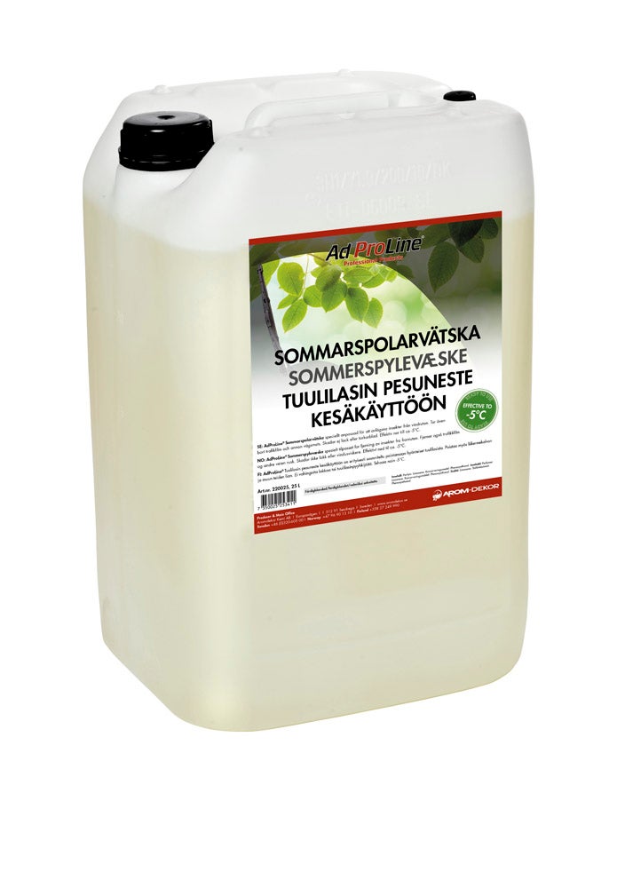 AdProLine® Sommarspolarvätska är baserad på noga utvalda råvaror för att säkerställa kvalitet och maximal rengöring av vindrutan. Etanolen är denaturerad enligt gällande europeiska normer och ger frysskydd ner till -5°C. Produkten är biologiskt nedbrytbar.