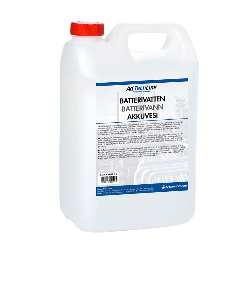 AdTechLine® Batterivatten är ett rent avjoniserat vatten. Det kan användas inom ett flertal användningsområden där höga krav ställs på ett rent vatten. Batterier, syranivån i bil- och båtbatterier ska ligga ca 5 mm ovanför plattorna i batteriet. Kontrollera batteriet regelbundet och fyll på med Batterivatten. Ångstrykjärn, användning av vanligt kranvatten i ett ångstrykjärn kan orsaka att det sätts igen av kalk. Använd därför alltid Batterivatten för att undvika problem.