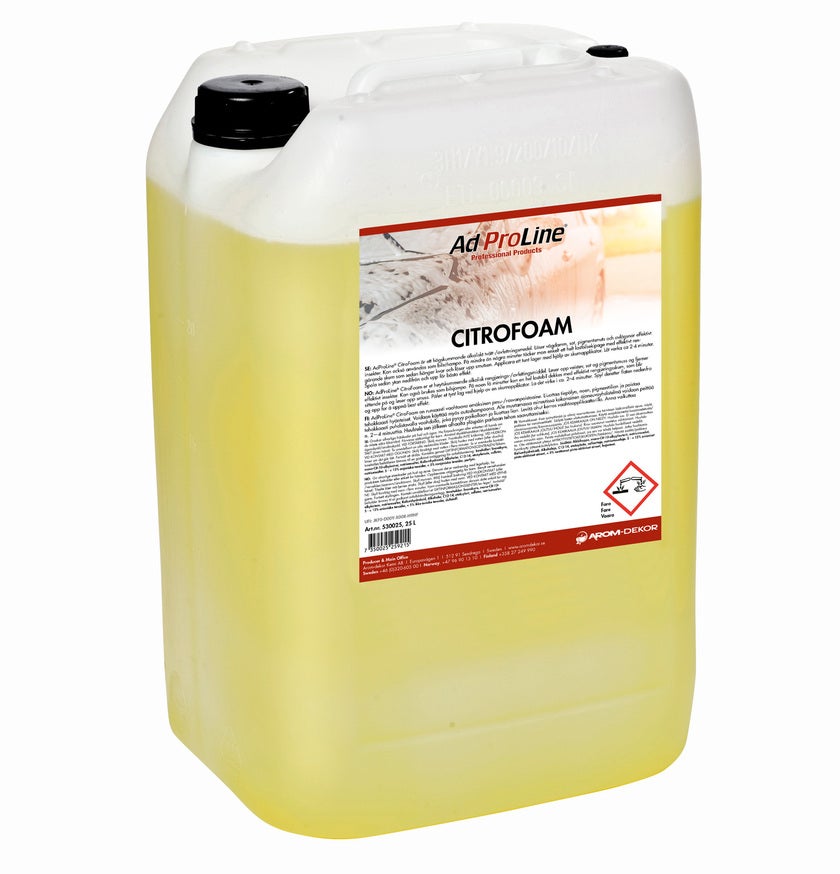 AdProLine® Citrofoam är ett högskummande alkaliskt tvätt/avfettningsmedel som lämpar sig för tvätt av såväl fordon som fasader eller andra ytor. Löser effektivt upp vägdamm, sot, pigmentsmuts och avlägsnar enkelt bort insekter. Kan också användas som bilschampo. Du täcker enkelt ett helt lastbilsekipage på några minuter med hjälp av en skumapplikator och det rengörande skummet hänger sedan kvar och löser upp smutsen.