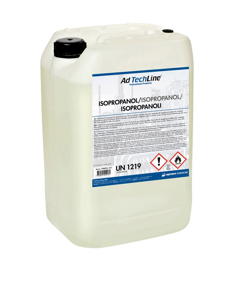 AdTechLine® Isopropanol är en kemiskt ren (min 99,5%) produkt som kan användas för rengöring på bland annat elektronik, mekanik och fiberoptik. Det går även bra att använda som kemisk tillsats i fuktvatten vid offsettryck. AdTechLine® Isopropanol avlägsnar effektivt oxid, vax, bläck, smuts och olja.