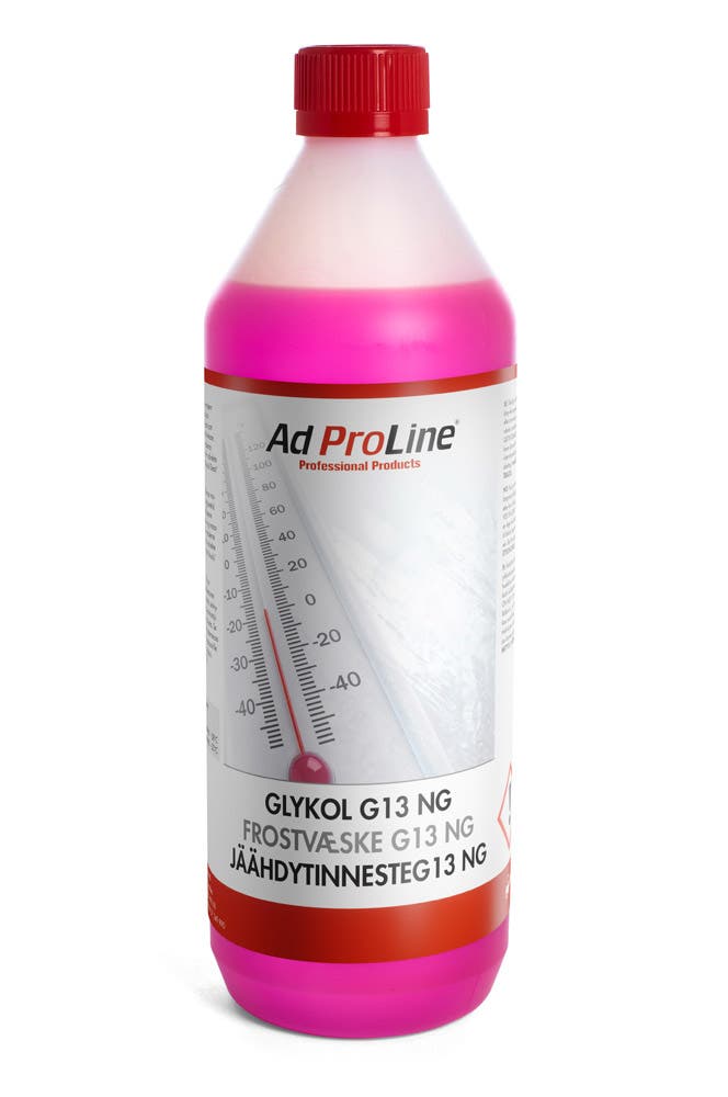 AdProLine® Glykol G13 NG består av monoetylenglykol och ett nyutvecklat inhibitorpaket baserat på OAT samt silikat som ger ett utmärkt korrosionsskydd för de flesta metaller inklusive aluminium. Innehåller ej 2-EHA, aminer, borater eller nitriter. Kontrollera kylarglykolens frysskydd varje höst och efterfyll vid behov. Etylenglykol är giftig och får ej förtäras. Den är biologiskt nedbrytbar och utsläpp av mindre mängder orsakar ej störningar i reningsverkens nedbrytningssteg.